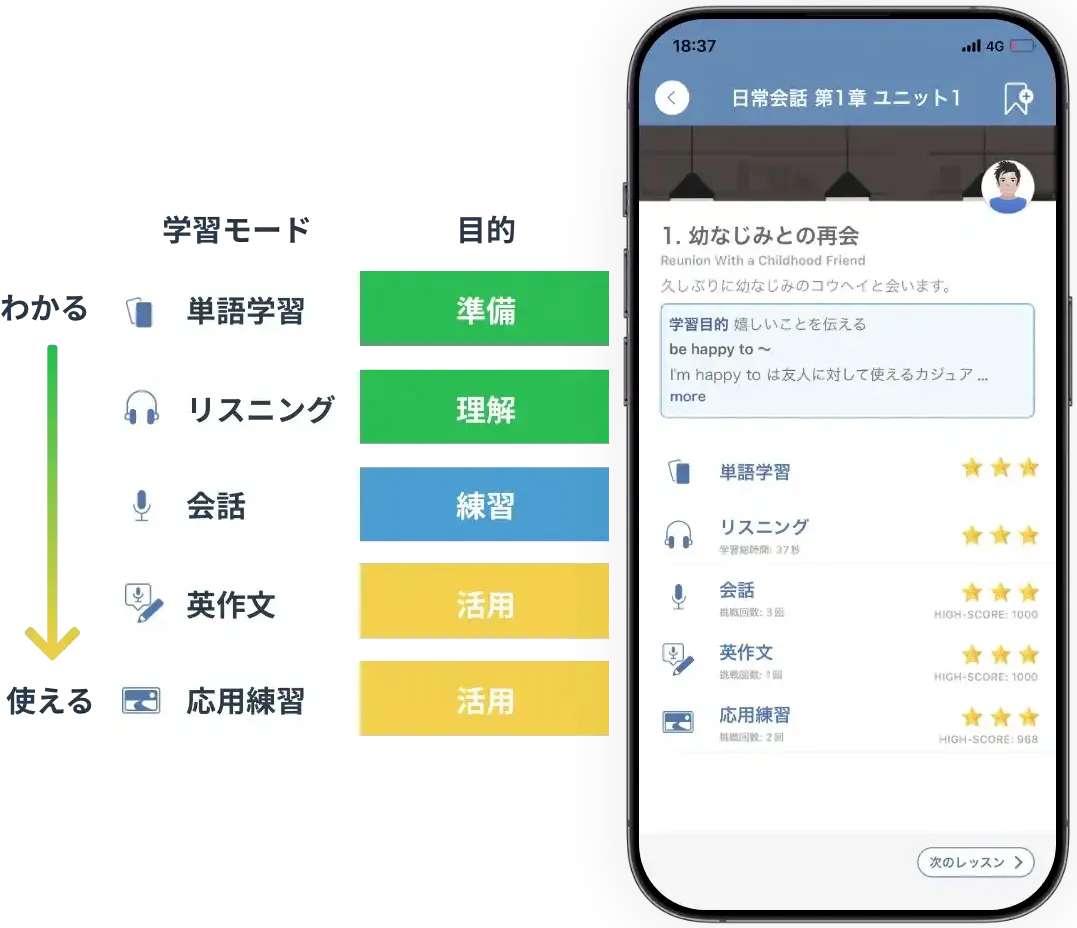 第二言語習得理論の知見を活かしたこだわりの学習設計で、「分かる」から「会話で使える」までの定着を実現します。